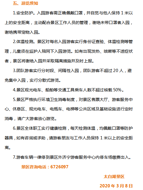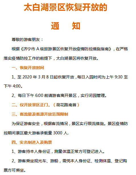 根據(jù)《濟(jì)寧市A級旅游景區(qū)恢復(fù)開放疫情防控措施指南》, 在嚴(yán)格落實(shí)疫情防控工作的前提下,太白湖景區(qū)將恢復(fù)開放。
