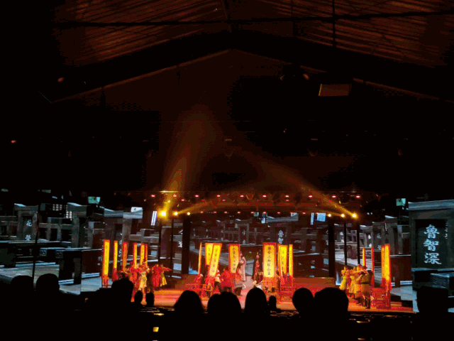 水滸大劇場觀看大型舞臺劇《忠義梁山泊》,該劇定位高端、精尖、精致,在編舞風(fēng)格、服裝設(shè)計、道具應(yīng)用、音樂選取等細(xì)節(jié)方面極為考究。演員服裝設(shè)計遵循“守舊但不固執(zhí),創(chuàng)新但不盲從”的設(shè)計理念,深入研究北宋時期服裝特點(diǎn),結(jié)合水滸傳人物性格及當(dāng)代觀眾的審美觀,再現(xiàn)800年前水滸英雄形象。在道具設(shè)計方面,真實(shí)還原每位好漢的武器,并力求符合舞臺藝術(shù)表演的特點(diǎn)。