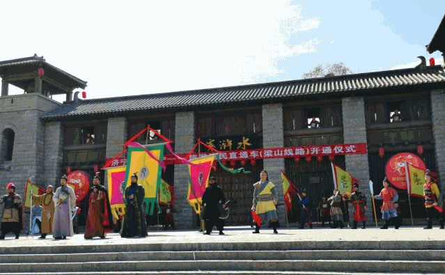 一路伴隨著歡歌笑語,沿途的美景,心情不由自主的變得愉悅。到達(dá)梁山將由演藝人員舉行“好漢迎賓”開城門儀式。音樂震撼、氣勢滂沱,仿佛穿越時空,夢回宋朝。