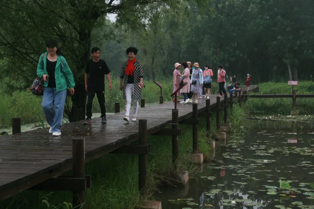 簡短的歡迎儀式后,游客乘坐觀光車,開始游覽微山湖國家濕地公園觀光火車、櫻花園、蘆蕩飛雪景區(qū)和鳥林等景點,并在湖岸廣場乘坐竹筏賞荷采蓮。