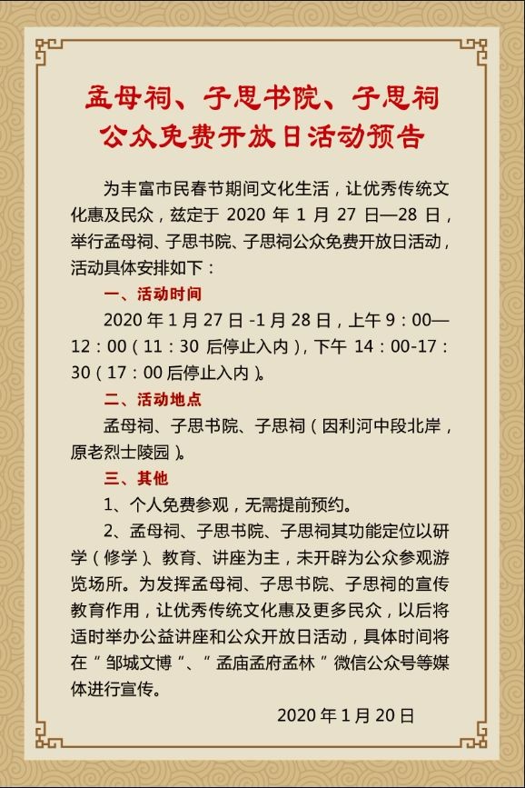新年將至,孔子文旅集團(tuán)鄒城市鄒魯文化公司結(jié)合文化旅游內(nèi)涵,深挖冬季旅游特色,聯(lián)合孟廟孟府、博物館、孟母三遷祠等景區(qū)推出一系列精彩紛呈的春節(jié)傳統(tǒng)禮儀體驗活動,快來一睹為快吧!
