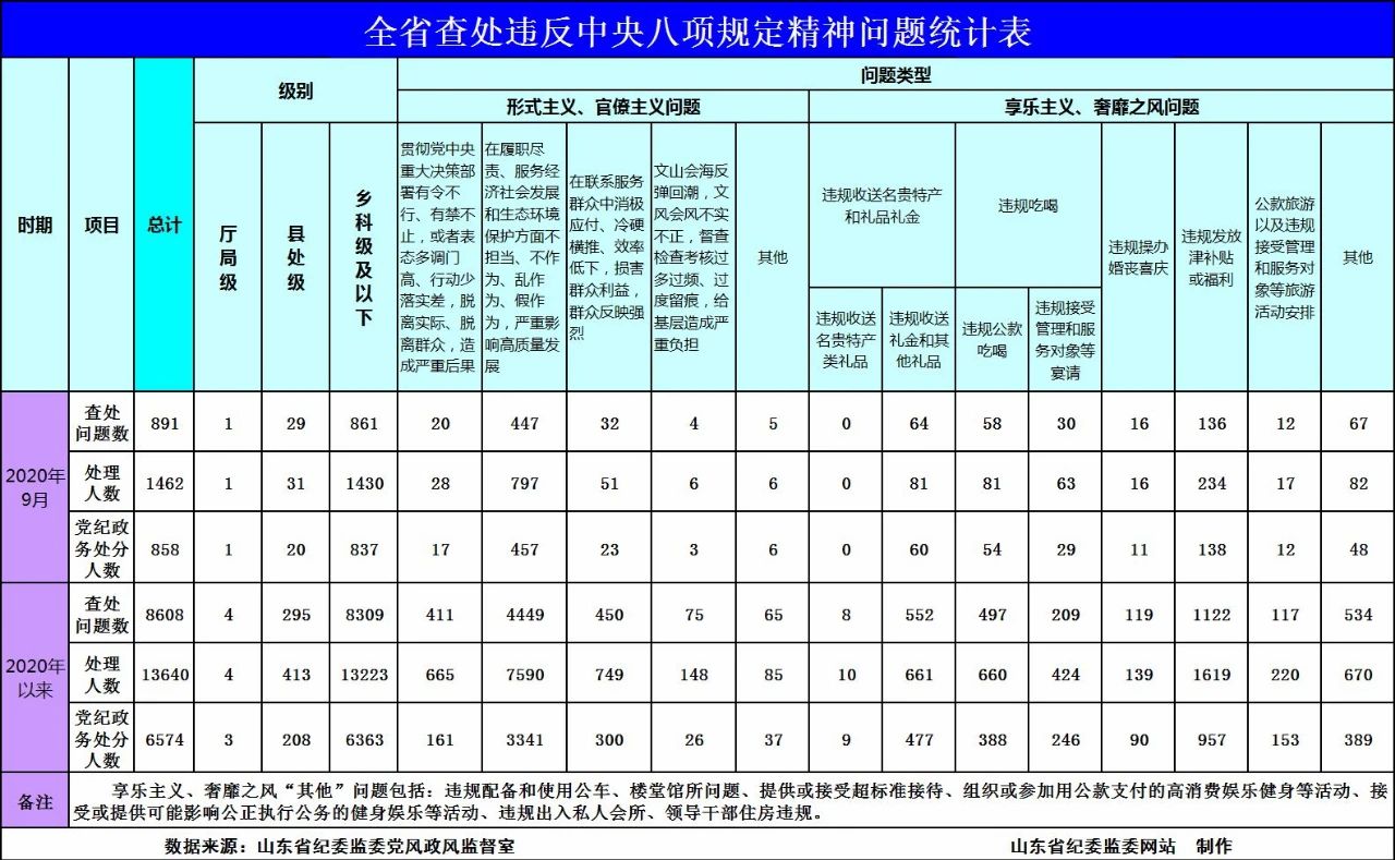 2020年以來,截至9月30日,全省查處違反中央八項(xiàng)規(guī)定精神問題情況如下: