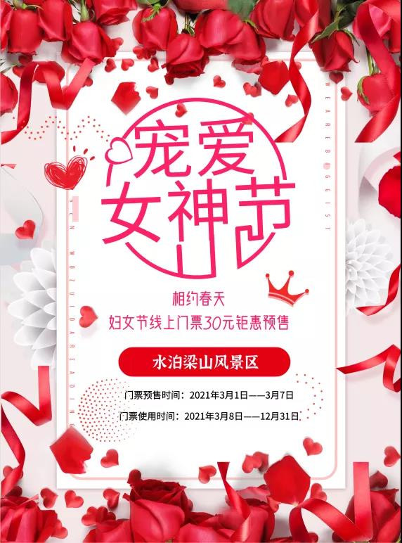 為慶祝2021年3月8日第111個(gè)國際婦女節(jié),水泊梁山風(fēng)景區(qū)推出“相約春天婦女節(jié)門票半價(jià)預(yù)售”活動(dòng)。