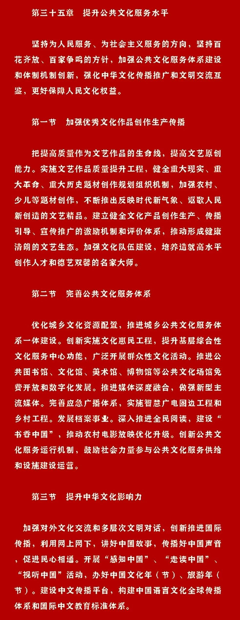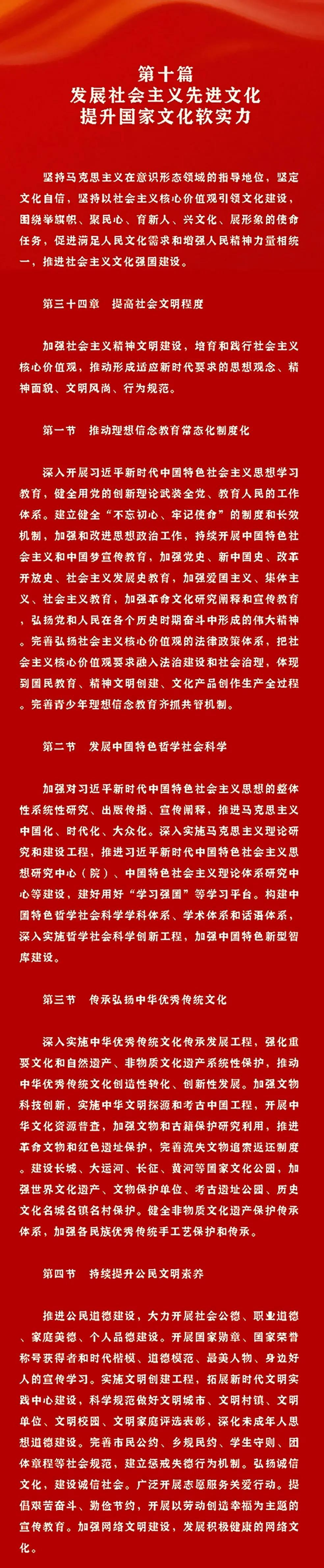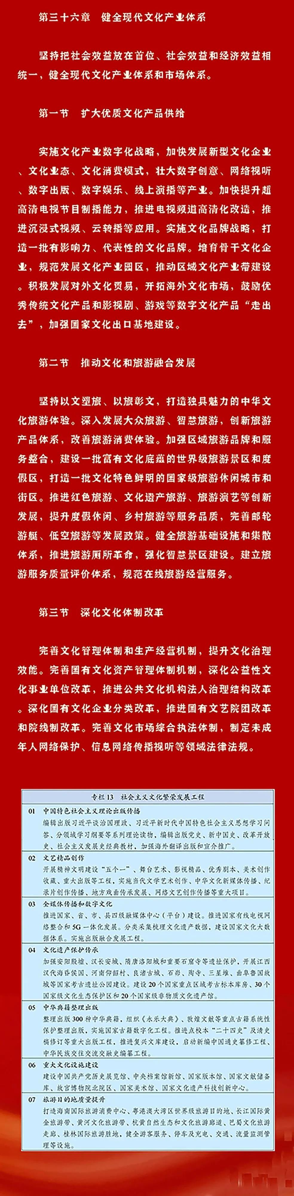 新華社3月12日全文播發(fā)了十三屆全國人大四次會議批準(zhǔn)的《中華人民共和國國民經(jīng)濟(jì)和社會發(fā)展第十四個五年規(guī)劃和2035年遠(yuǎn)景目標(biāo)綱要》。“十四五”規(guī)劃和2035年遠(yuǎn)景目標(biāo)綱要在“2035年遠(yuǎn)景目標(biāo)”部分明確提出,建成文化強(qiáng)國、教育強(qiáng)國、人才強(qiáng)國、體育強(qiáng)國、健康中國,國民素質(zhì)和社會文明程度達(dá)到新高度,國家文化軟實(shí)力顯著增強(qiáng)。在第十篇《發(fā)展社會主義先進(jìn)文化 提升國家文化軟實(shí)力》中,對推進(jìn)社會主義文化強(qiáng)國建設(shè)作出具體規(guī)劃,具體內(nèi)容如下。