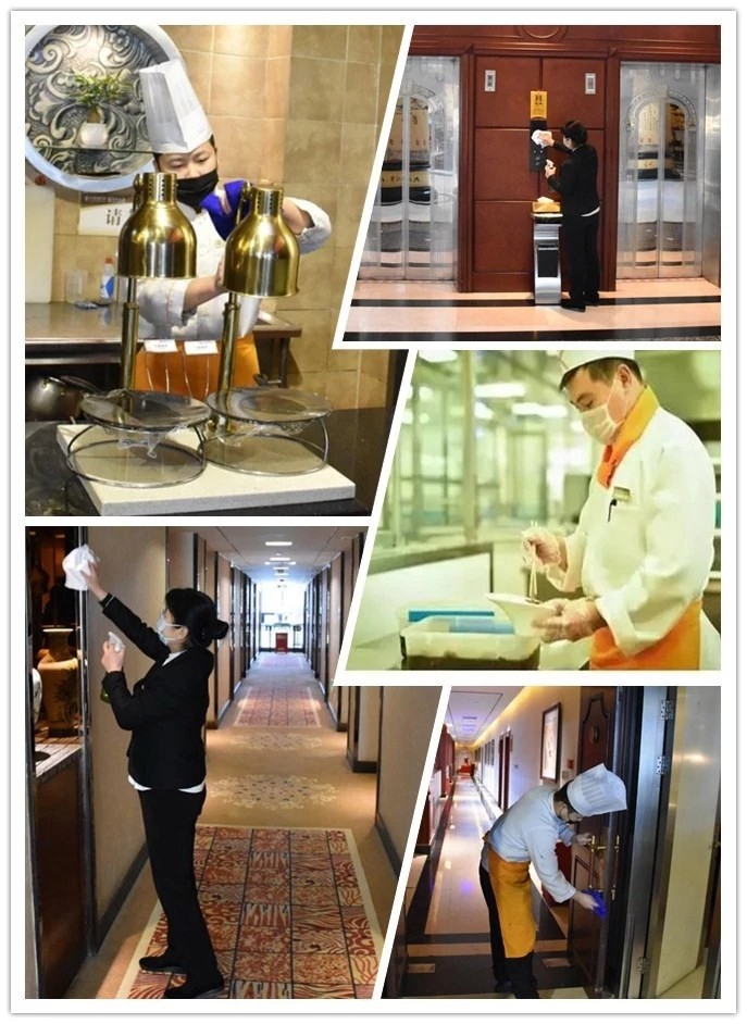 餐飲部設(shè)計(jì)菜單時避開海鮮等生鮮菜品,廚房制作菜肴確保蒸熟煮熟;包間進(jìn)行開窗通風(fēng),餐具嚴(yán)格按照消毒程序進(jìn)行消毒;廚師操作過程中佩戴一次性手套及口罩。