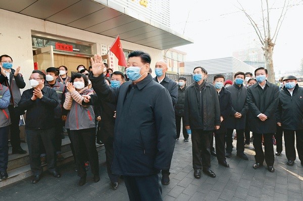 2020年2月10日,中共中央總書記、國家主席、中央軍委主席習近平在北京調(diào)研指導新冠肺炎疫情防控工作。這是習近平來到朝陽區(qū)安貞街道安華里社區(qū),了解基層一線疫情聯(lián)防聯(lián)控情況。 新華社記者 鞠鵬/攝